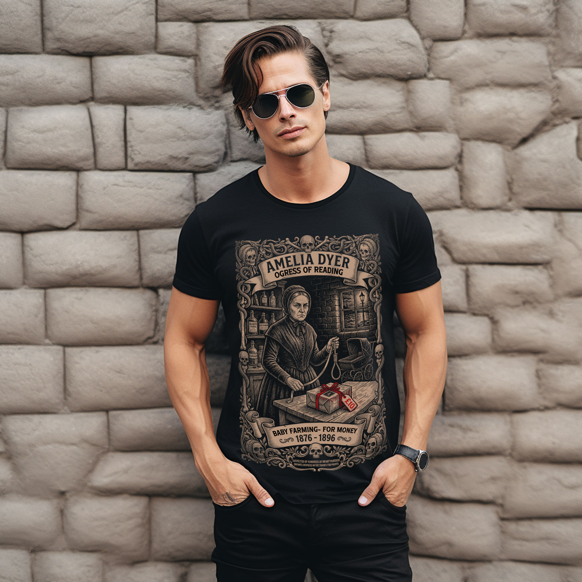 Na tej koszulce poznasz Amelia Dyer, znaną w mrocznych kronikach jako „Ogrzyca z Reading”. Wiktoriańska dama z bardzo… nietypowym podejściem do opieki nad dziećmi i biznesu prowadzonego bez zbędnych skrupułów.