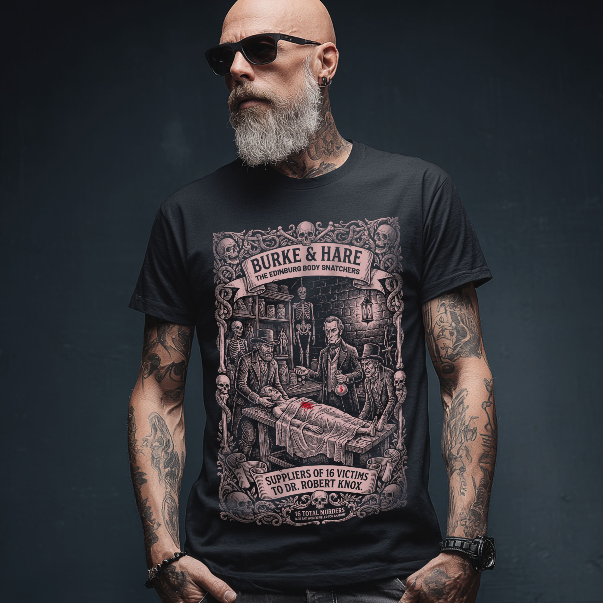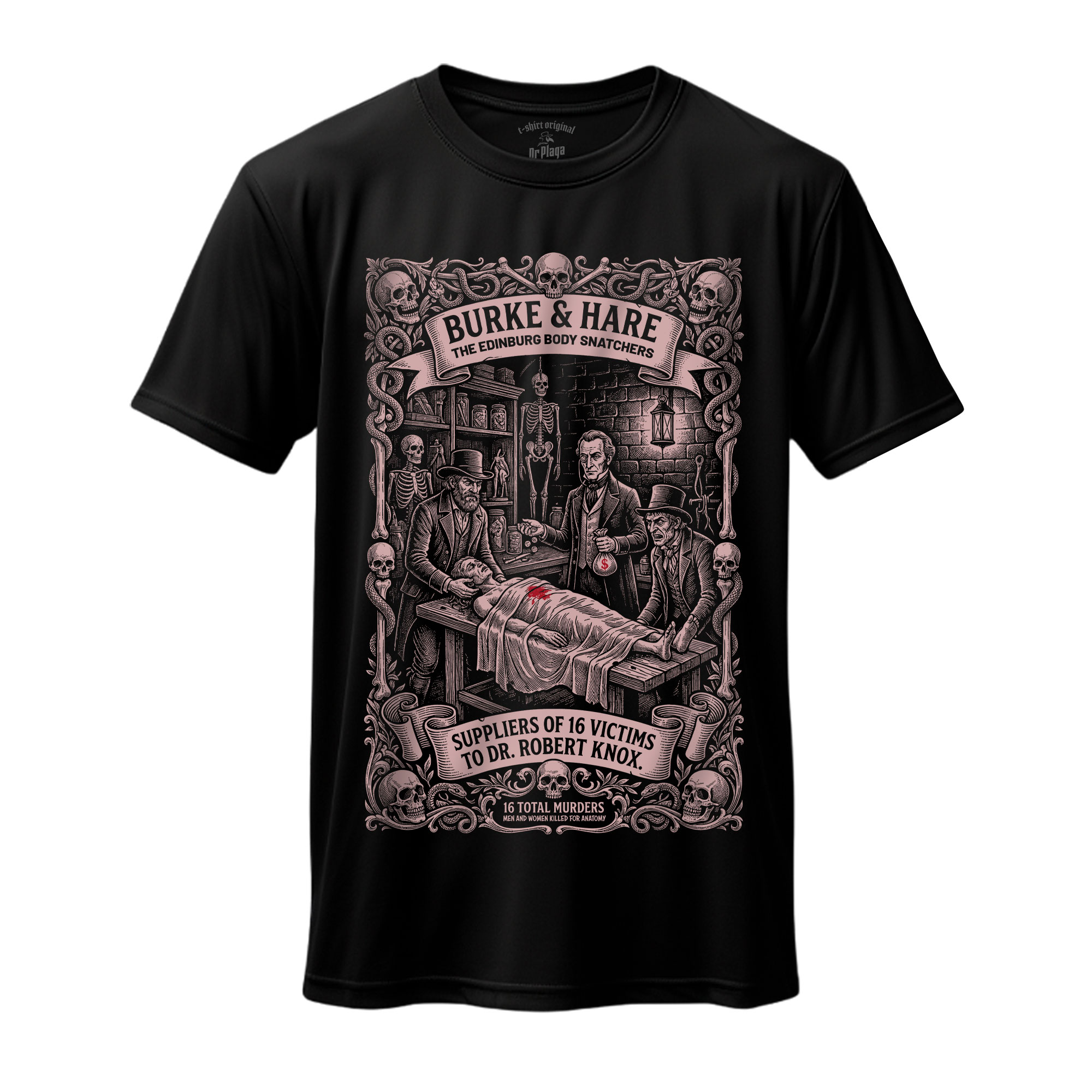 Koszulka inspirowana mroczną historią Edynburga i najsłynniejszym duetem „dostawców anatomii” — Williamem Burke’em i Williamem Hare’em. Eleganccy dżentelmeni, medycyna XIX wieku i interesy prowadzone zdecydowanie po zmroku. Czarny humor, makabryczny klimat i historia tak dziwna, że wydarzyła się naprawdę.