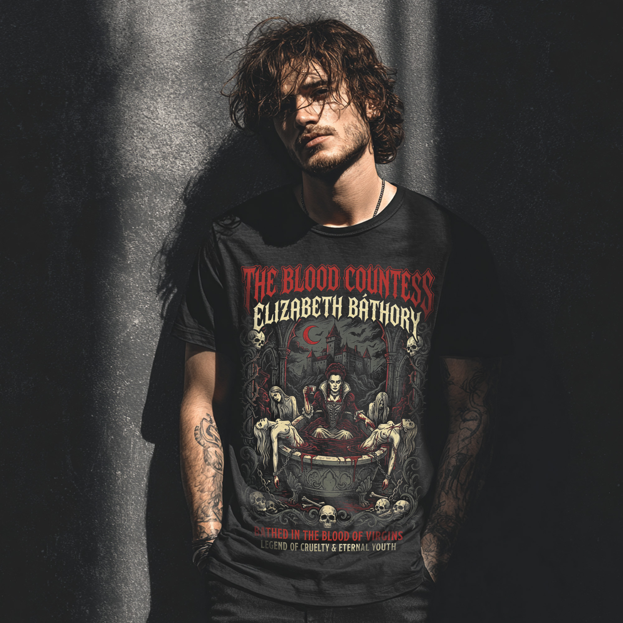 Motyw nawiązuje do postaci Elżbiety Batory, symbolu okrucieństwa, obsesji na punkcie młodości i najmroczniejszych legend Europy. Koszulka z printem inspirowanym legendą Krwawej Hrabiny to propozycja dla tych, którzy lubią mocny, mroczny styl i wzory z charakterem. Gotycki klimat, odrobina grozy i dużo wyrazistej energii sprawiają, że trudno przejść obok niej obojętnie. Idealna dla fanów horroru, dark fantasy i mrocznej estetyki,