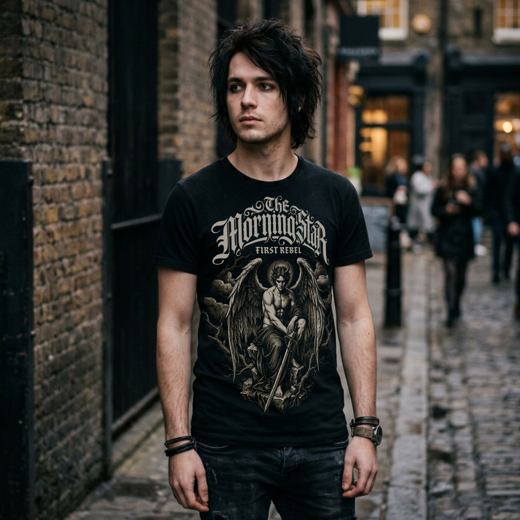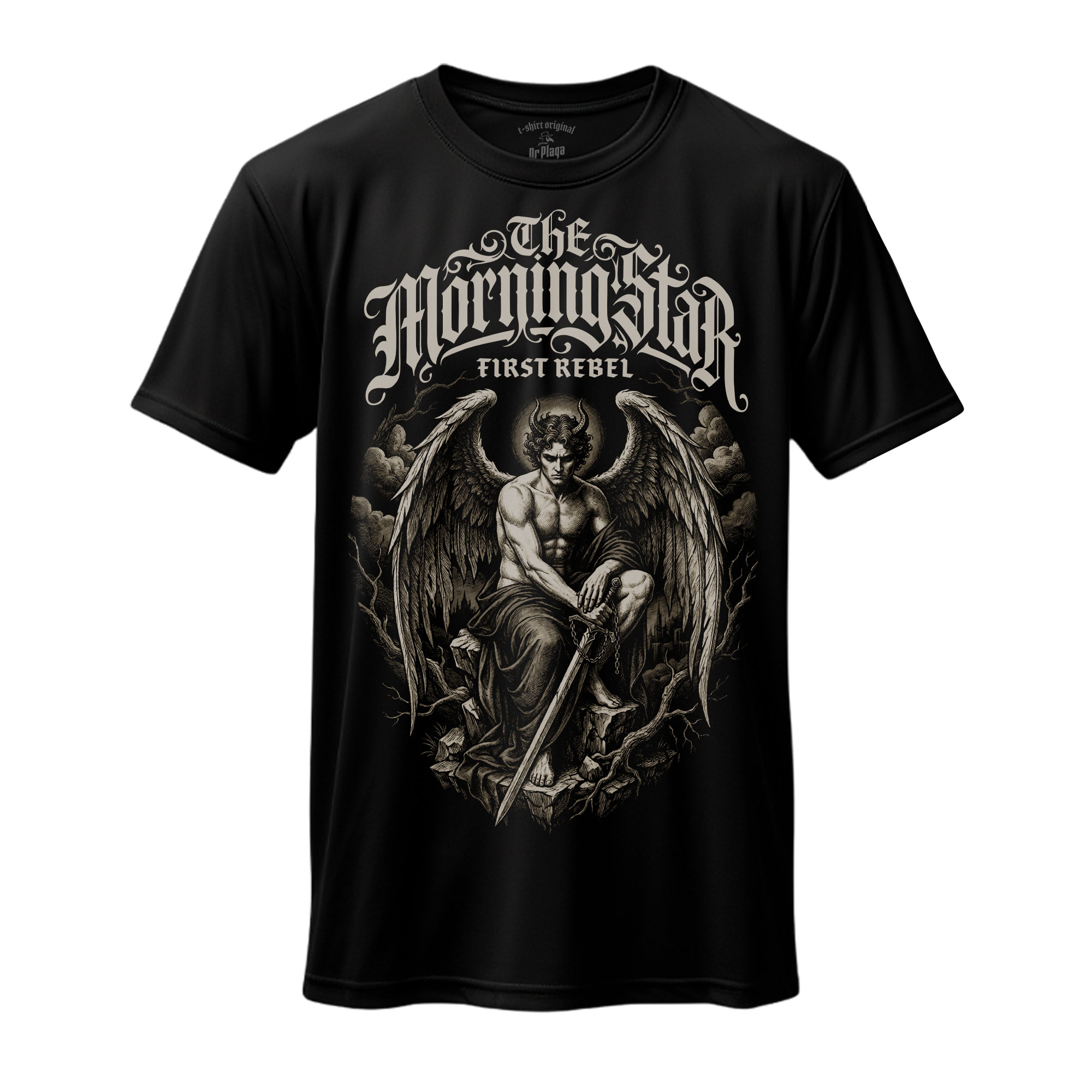 Ta koszulka przyciąga uwagę mroczną, monumentalną estetyką inspirowaną postacią Lucyfera jako Gwiazdy Porannej i pierwszego buntownika. Wzór łączy symbolikę upadłego anioła, niezależności i sprzeciwu wobec narzuconego porządku, tworząc projekt o silnym, niepokornym charakterze. To propozycja dla osób, które lubią dark art, gotyckie motywy i nadruki niosące wyrazisty przekaz, balansujący między pięknem, buntem i tajemnicą.