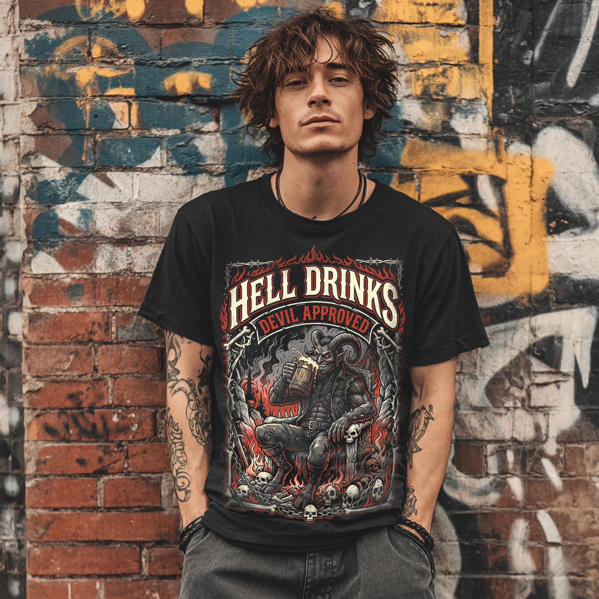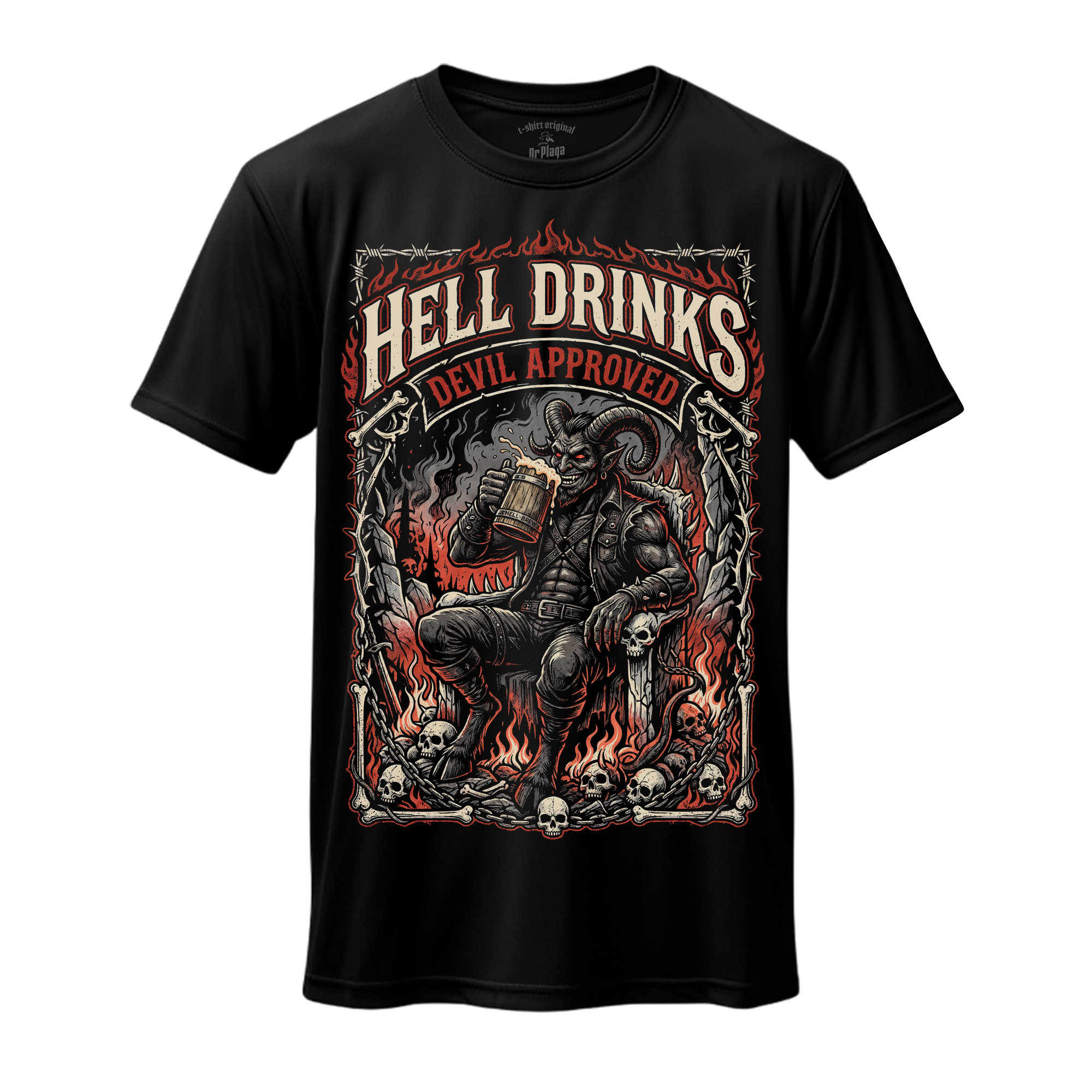 Ten wzór wygląda tak, jakby piekło w końcu dorobiło się własnego pubu i od razu zdobyło certyfikat jakości od samego diabła. Całość bawi się motywem grzesznej imprezy, piekielnego luzu i humoru tak czarnego, że spokojnie mógłby podpisać rachunek krwią. To koszulka dla osób z dystansem, które lubią absurd, mocny klimat i nadruki sprawiające wrażenie, jakby najlepsze drinki serwowano dopiero po potępieniu.