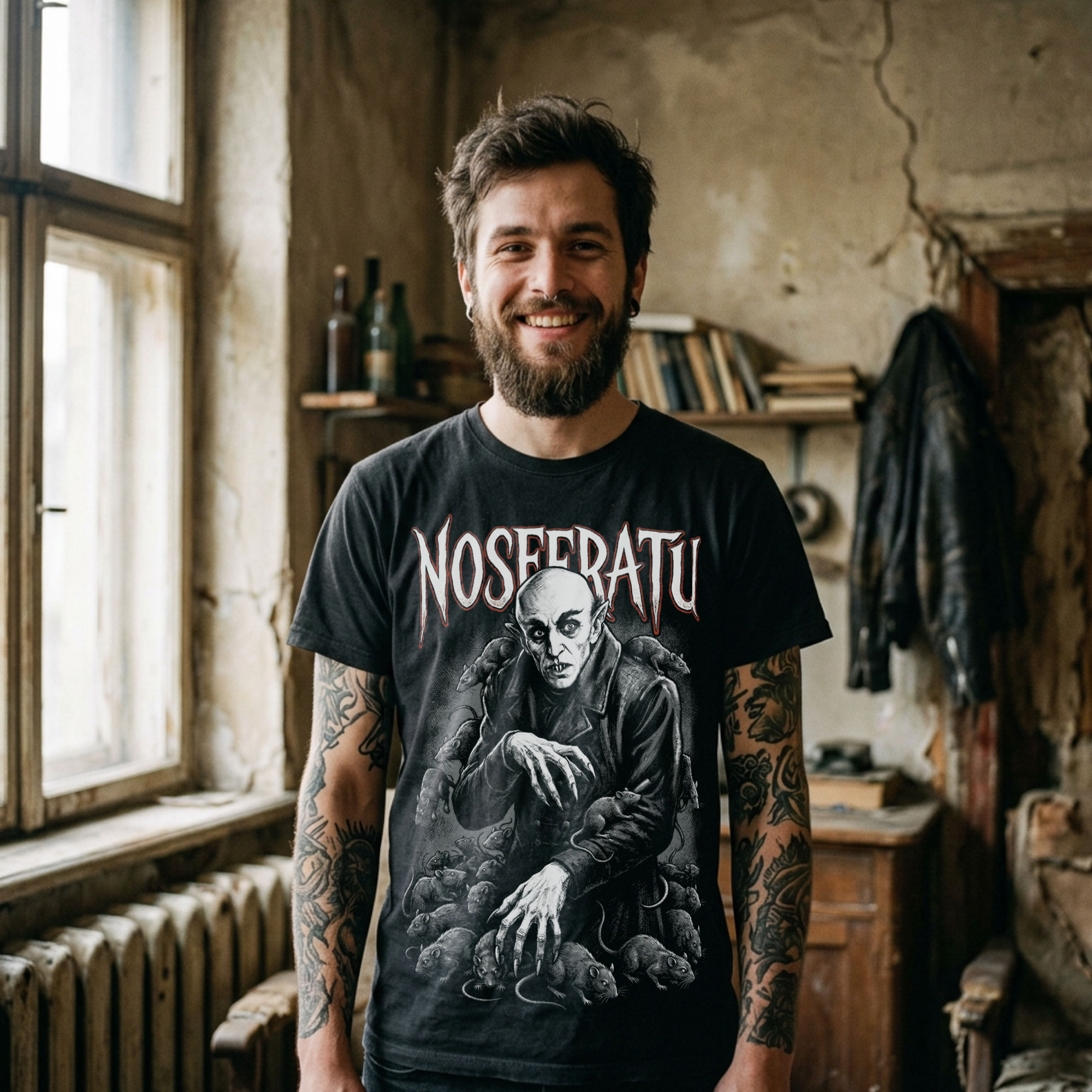 Ten wzór czerpie z kultowej postaci Nosferatu, jednego z najbardziej ikonicznych symboli klasycznego horroru. Łączy gotycki mrok, niepokojącą elegancję i atmosferę starego kina grozy, tworząc projekt o ponadczasowym charakterze. To propozycja dla fanów wampirycznej estetyki, czarno białych motywów i nadruków, które niosą ze sobą wyraźne odniesienie do legendy horroru