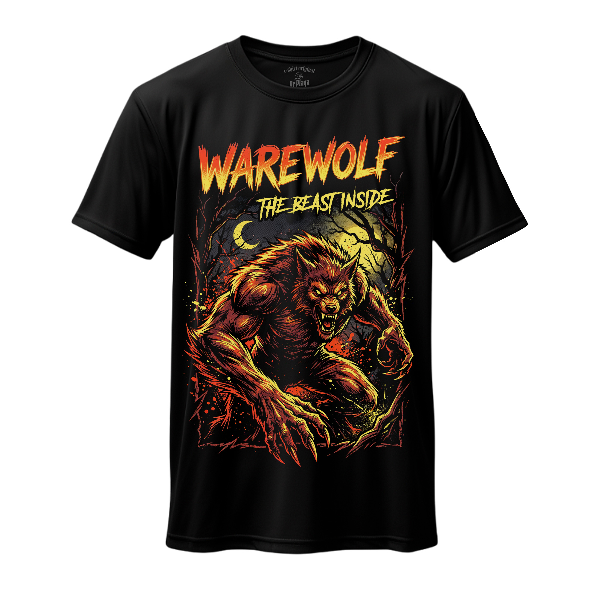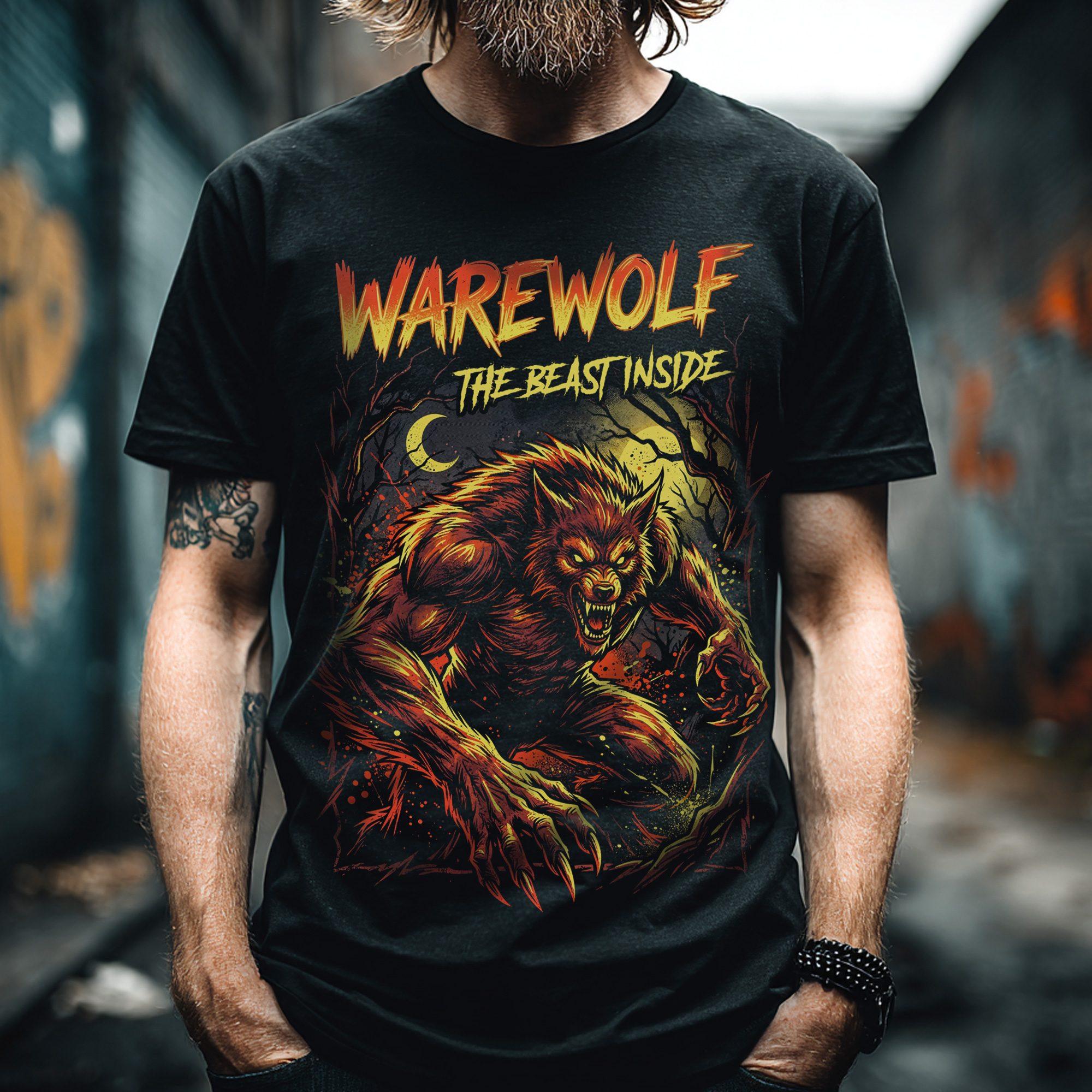 Ten wzór odwołuje się do motywu wilkołaka jako symbolu dzikości, instynktu i mrocznej siły ukrytej pod powierzchnią. Nawiązuje do klasycznych legend grozy, w których człowiek zmaga się ze swoją pierwotną naturą i wewnętrzną bestią. To projekt dla fanów horroru, potworów i ciemnej estetyki. Koszulka przyciąga uwagę energią, agresywnym charakterem i motywem, który od lat pozostaje ikoną świata grozy.